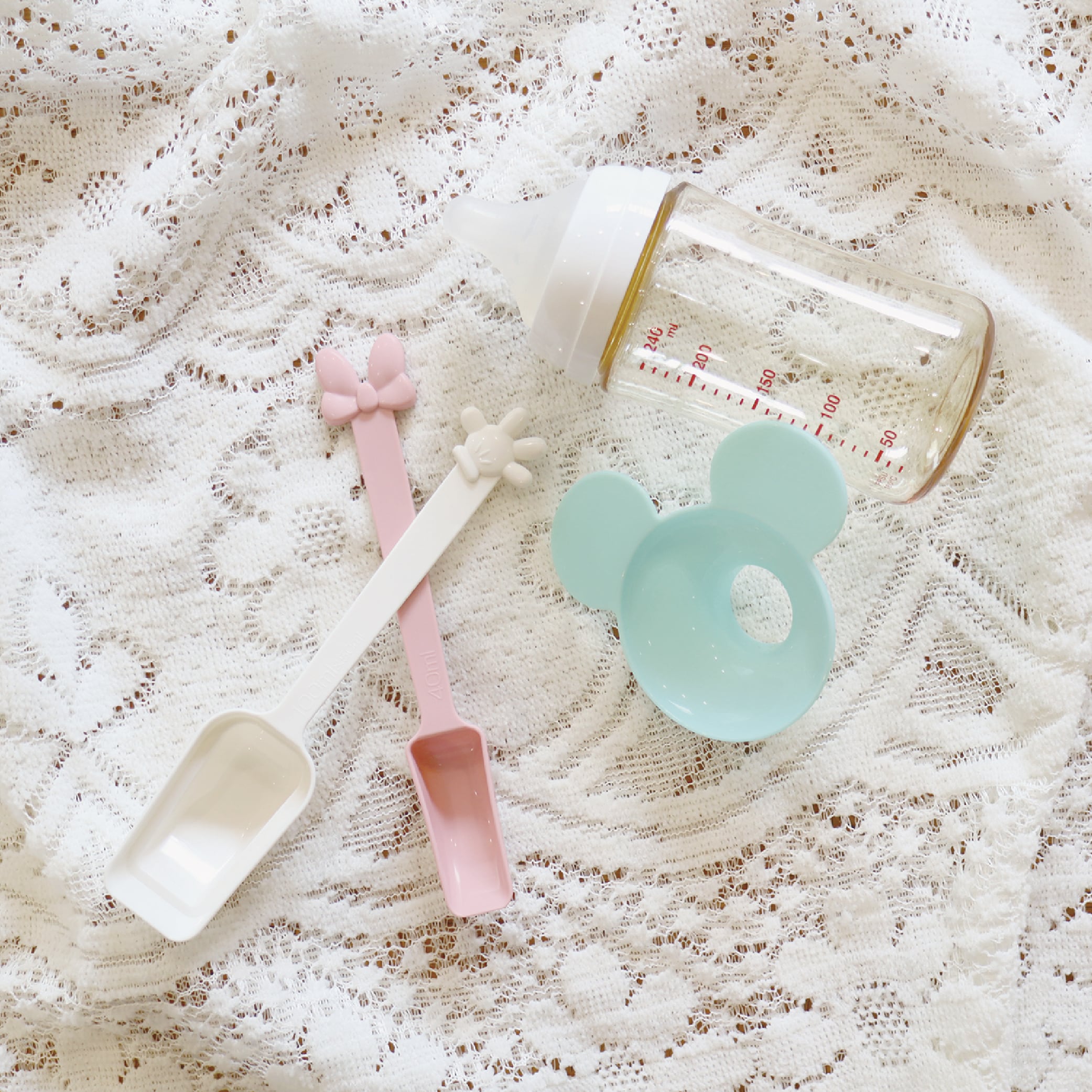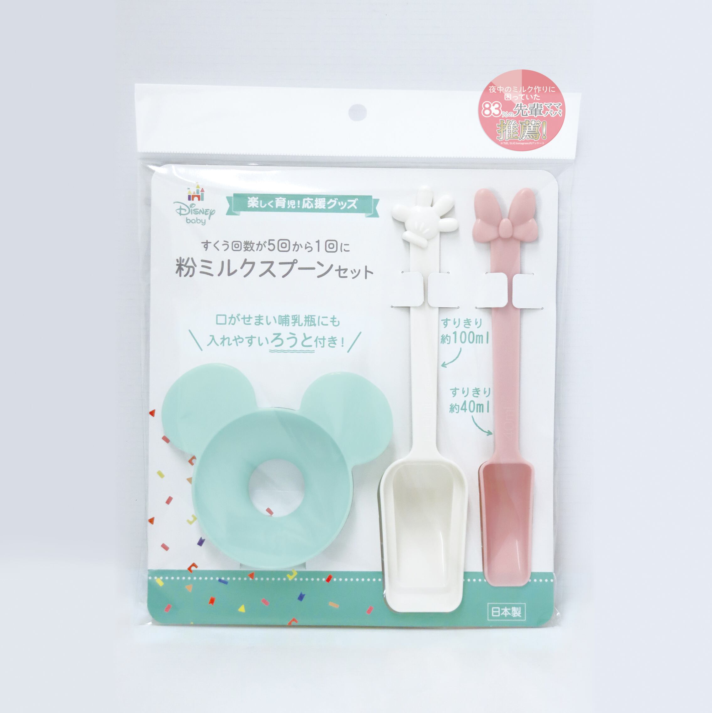 50mlの段差がついた100mlスプーンにはミッキーグローブが、40mlスプーンにはミニーのリボンのマスコットが付いてかわいい♡