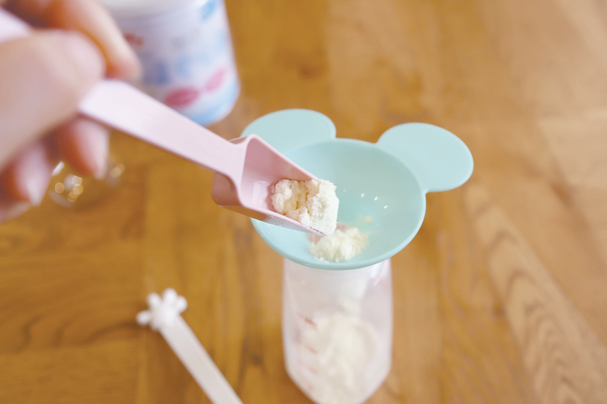 粉ミルクをすくう回数が減らせるスプーンと、注ぎ口が直径28mm以上の哺乳瓶に対応したろうとの3点セットです。